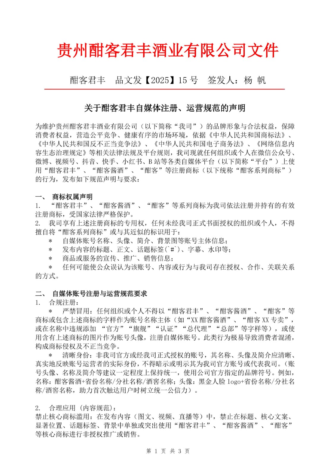 关于酣客君丰自媒体注册、运营规范的声明