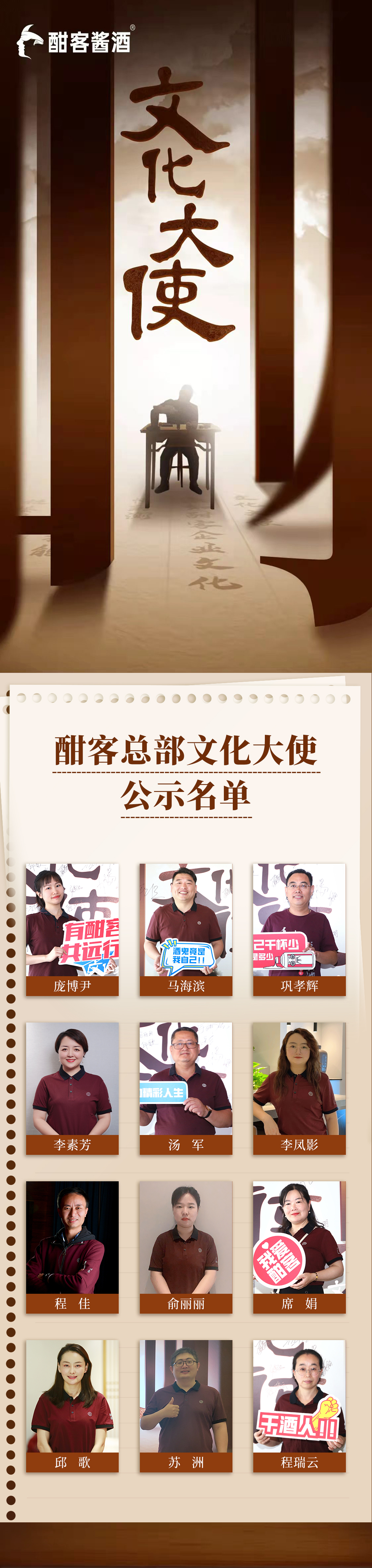 此次入选“2023年酣客文化大使”的12位酣亲分别是:庞博尹,马海滨,巩孝辉,李素芳,汤军,李凤影,程佳,俞丽丽,席娟,邱歌,苏洲,程瑞云。